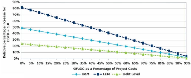 While substantial completion payments have been used for the purposes of this example, the relationship holds when the GFuDC takes the form of milestone payments. DBRS notes that the inverse relationship occurs when considering a project's resilience during operations versus the amount of debt relative to GFuDC, and not as a function of the absolute debt level.