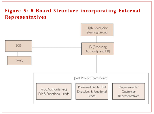 7.12 In this example new boards have been created which sit alongside and are additional to the internal boards (for example as described above). These additional joint boards are instigated to deal with the specific activities that are key to achieving contract award. Joint boards - i.e. with representatives from both the public and private sectors - can function effectively as many of the issues are outside the sole control of either party. However there remain activities, such as confirming the requirement and affordability envelopes, or seeking internal(e.g. HMT) approvals etc., that will need to be dealt with via the internal project governance arrangements.