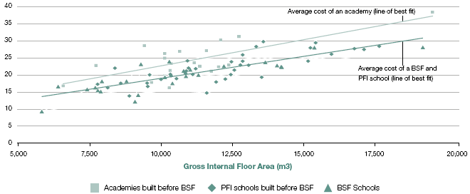 The price of BSF schools compared to the price of Academies and PFI schools built before the BSF programme |