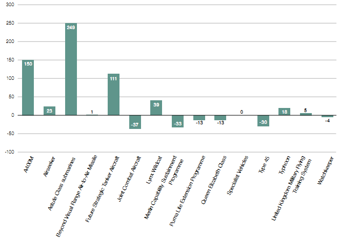 • £176 million has been added by macro-economic factors, primarily exchange rate changes on the A400M aircraft (classified), Typhoon aircraft (+£91 million) and the Joint Combat Aircraft (-£35 million).