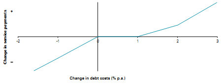 The risk sharing mechanism, shown in Figure 4, applies to increases in total debt finance costs above those assumed in the project financial model. (Front-end fees are amortised over the term of the debt and added to interest costs.) PPP Co bears the full risk of cost increases up to a pre-defined threshold (say, 1 percent p.a.). Between this threshold and a second threshold (say, 2 percent p.a.), the government bears a proportion (say, 40 percent) of the additional debt finance cost, through an adjustment to Service Payments. Where debt finance costs exceed the second threshold, the Government bears the large majority (say, 80 percent) of the additional costs, leaving PPP Co to bear the remaining 20 percent.