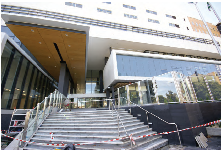 The fagade and main entry of the new hospital receiving final finishing works.