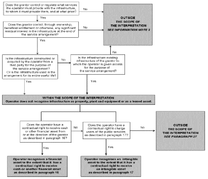IFRIC 12 states that it is control that determines the accounting treatment by the operator. If the grantor retains control, then the infrastructure asset is not an asset of the operator. This suggests that the infrastructure asset becomes or remains (depending on how the infrastructure asset is provided) an asset of the grantor. The flowchart below, taken from IFRIC 12 (paragraph references in the table are to paragraphs in IFRIC 12), shows how the operator can determine whether or not the concession arrangement is within the scope of IFRIC 12.