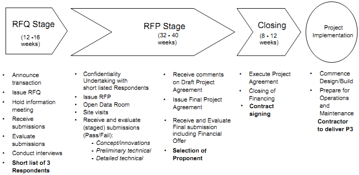 The following chart provides an overview of a typical Alberta government P3 transaction process. The indicative timelines are those for a large, complex P3 project. These timelines will be adjusted depending on the nature of the project and the specific details of the procurement process. The timelines do not include the issuing of a Request for Expression of Interest (REOI). A REOI may be issued during the P3 assessment and approval stage (see Management Framework: Assessment guidelines).