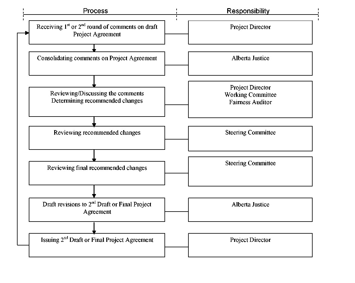 The Working Committee led by the Project Director and Alberta Justice will be responsible for the development of the Project Agreement, including the incorporation of comments from Proponents. Comments on the draft Project Agreement from Proponents are processed according to the following procedures: