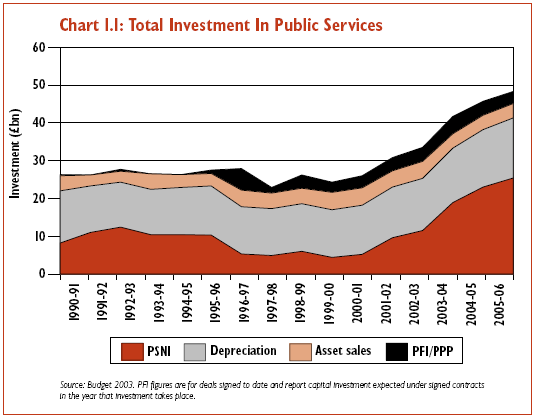1.4 The Government is committed to reversing this legacy of under-investment in public service infrastructure. Public Sector Net Investment will rise to 2.1 per cent of GDP by 2005-06, while total investment - which includes PSNI, depreciation, recycled proceeds from asset sales and estimated private sector investment in public services through PFI and PPPs - is set to rise to more than £47 billion over the same period. This is the largest sustained increase in public sector investment in over twenty years.