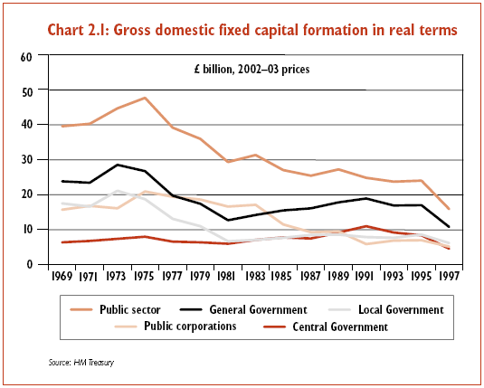 2.3 This fall in public sector investment translated into a marked decline in general government capital spend, in both central and local government, since the start of the 1990s. Chart 2.1 sets out gross fixed capital formation, the acquisition less disposal of fixed assets, by government sector. These figures show the decline in public corporation and local government capital spend caused by the shrinkage of the public sector over the 1970s and 1980s, and also the downturn in capital investment between 1990 and 1997.