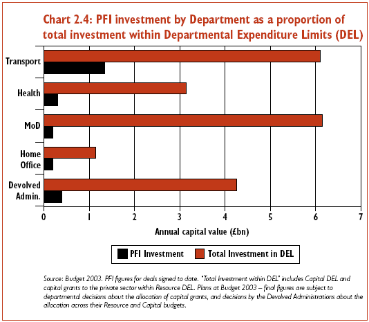 2.10 PFI remains a limited proportion of government investment within any particular sector. Chart 2.4 shows PFI investment compared with total capital investment undertaken within departmental budgets for key spending departments (excluding investment funded by asset sales), and for the devolved administrations. In no case does PFI represent more than around a quarter of investment being undertaken in a sector.