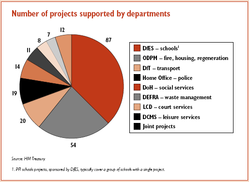 Box 2.1: PFI in local authorities Much of the PFI programme is delivered by local authorities, largely with revenue support provided by sponsoring departments. So far, 119 local authority projects have been signed, 97 of which are now operational, and a further 119 schemes are in various stages of procurement. The chart below, which shows all the local authority PFI projects, signed and unsigned, by sector, illustrates how PFI is helping authorities meet local priorities.