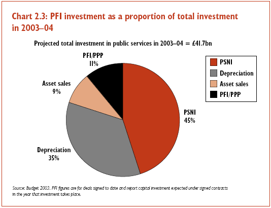 2.8 Total investment in public services will rise to over £48 billion in 2005-06, compared with £23 billion in 1997-98, a 7 per cent average annual increase after inflation. Total UK investment in public services includes: Public Sector Net Investment, reflecting conventional capital spending undertaken within departmental budgets; recycled proceeds from asset sales which are re-invested in capital on top of the budgets already available to departments; depreciation, to reflect the ongoing capital investment in existing assets to repair buildings and carry out maintenance; and investment carried out by the private sector on public service assets under PFI (including maintenance).