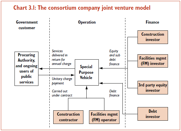 3.37 The benefits of this consortium joint venture structure are that it permits different parties to become involved in the PFI scheme and share the risks effectively. It also permits the involvement of third party funders who must assess the strength of the contractual arrangements and the level of support offered as they rely on these when it comes to repayment of their loans.