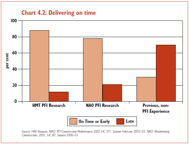 4.7 A key focus of the research was to assess how far PFI delivered new assets on time. The sample suggested that PFI was delivering new assets on time across the public sector. 88 per cent of projects were built on time or early. This strong track record of PFI is borne out by a comparison of the HM Treasury findings with those of the National Audit Office (NAO). A recent NAO report1 found that of a sample of 37 projects, only 8 per cent of PFI schemes were delayed by more than two months.