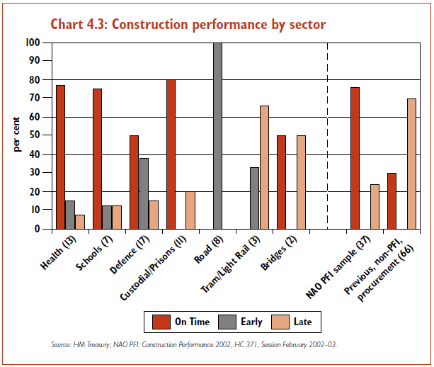 4.9 Chart 4.3 shows PFI construction performance by sector. For school, hospital and defence projects (of which a high proportion were accommodation projects), very few schemes experienced delays. No prison and road projects surveyed were delivered late. In some sectors, such as light railways, the planning difficulties in densely populated urban areas and inherent inflexibilities in the schemes mean that PFI has been less successful in meeting initial delivery timetables. However, unlike conventional procurement, the direct financial costs associated with these delays were not borne by the public sector and payment only began to flow to the private contractor once the asset was complete and the service was underway.