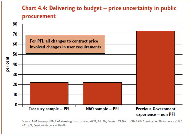 4.12 Overall both HM Treasury research and the earlier NAO sample suggest that PFI provides high levels of price certainty for the public sector, particularly in comparison to the budget overruns experienced in traditional procurement, demonstrating that construction risk had been effectively transferred to the private sector: