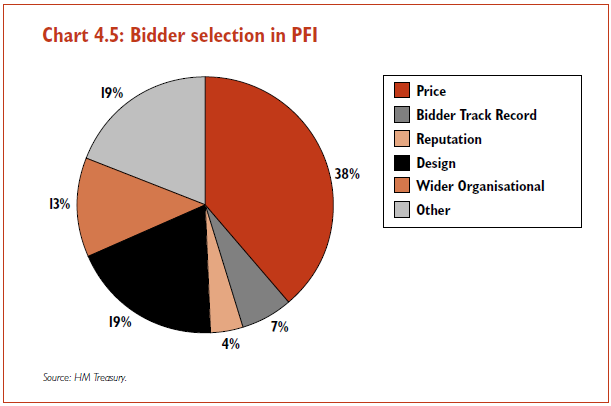 4.17 The Government is clear that value for money should not be equated with the lowest cost option, but should instead identify the optimum combination of whole life cost and quality. Chapter 8, paragraphs 8.42 to 8.44 outline the Government's plans to investigate further bidder selection in PFI. Box 8.1 outlines the Government's approach to encouraging good design in public procurement.
