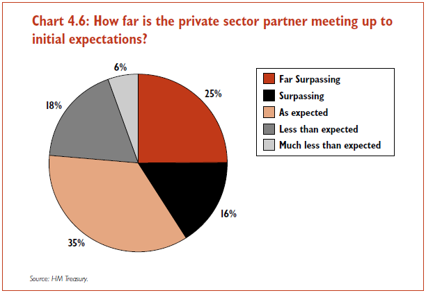 4.23 Research by HM Treasury, and also by the NAO, has sought to gain some initial indication of operational project performance by surveying the opinions of public sector managers. HM Treasury asked respondents to indicate how far "overall performance of the private sector partner" was "matching up to expectations at the time of contract close".
