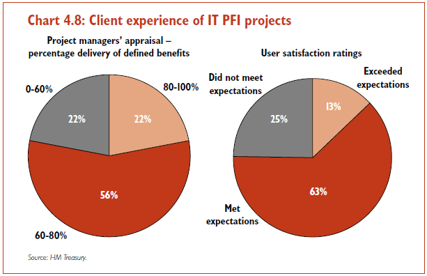4.54 Most (75 per cent) of these projects were regarded as fulfilling or exceeding user expectations. However, only 22 per cent of projects were, according to managers, delivering 80 to 100 per cent of defined programme benefits (see Chart 4.8). This is in line with the result obtained in the Standish Group's survey of IT outsourcing.