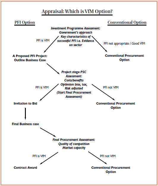 By applying this appraisal process throughout the competitive process, public sector clients will safeguard value for money by: • ensuring there is no inherent preference for a particular procurement option; • making the quality of the competition an explicit part of evaluation; • encouraging intelligent management of market capacity as part of procurement and pre-tender dialogue; • feeding information back into projects and programmes in earlier stages of procurement. This will be supported going forward by the improved signed deals list and the adviser database; and • providing an early warning of when competitive tension may be reducing, and how this can be remedied. PFI procurement will only be pursued if these assessments show that it will deliver value for money. |