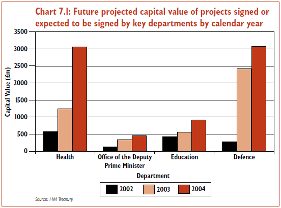 7.23 The Department of Health are expecting to see both the number and capital value of deals signed rise significantly over the next two to three years. The projected number of deals for health is 55, amounting to a total capital value of £6.5 billion by the end of the 2005 calendar year. The projected capital value for Ministry of Defence PFI projects is also expected to rise with an estimated 14 deals totalling £5.7 billion over the same period.