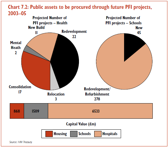 7.24 This investment is expected to deliver significant new public infrastructure over the next few years. As shown in Chart 7.2 above, the PFI investment programme in health projects is expected to deliver 11 new hospitals or other health facilities, and redevelop or consolidate to a central site 44 more. In education, £1.5 billion in planned investment will redevelop or refurbish 278 schools and deliver 45 new schools. In housing, 28 PFI projects will deliver capital investment estimated at over £800 million, even without the potential new applications of PFI in social housing discussed at paragraph 7.53 below.