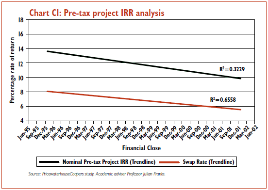 C3 A PFI scheme's cost of finance is the combined cost of its debt and equity, taking account of the proportion of equity in the scheme, usually being ten per cent of the total. The PwC study provides data which is useful in assessing the expected overall cost of capital which is usually referred to as the Project Internal Rate of Return (Project IRR). This is usually equivalent to the cost to the project of the debt, equity return and tax paid thereon. As Chart C1 illustrates, since 1995, this "all-in" cost of private finance has fallen from 13.5 per cent to just under 10 per cent by 2001.