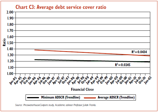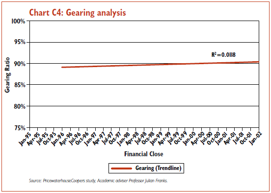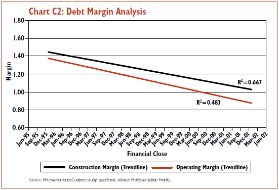 C5 The PwC study also analyses the specific costs of the debt finance used in PFI schemes, which have also been improving from the public sector's perspective over the period of the PwC study. The cost of debt comprises of the margin paid for credit risk taken, the requirement lenders have for equity, which is reflected in cover ratio calculations, and levels of financial gearing and front end fees. Key results of PwC's analysis are laid out below.
