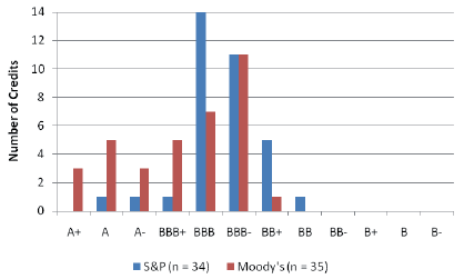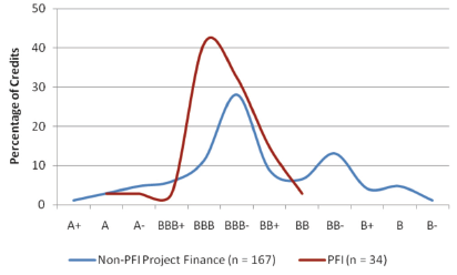| Standard & Poor's rates 34 PFI projectsviii. Moody's rates 40ix, five of which are not made public. 27 PFI projects are rated by both agencies. On average, for those 27, Moody's FIGURE 1: RATING DISTRIBUTIONS FOR PFI CREDITS