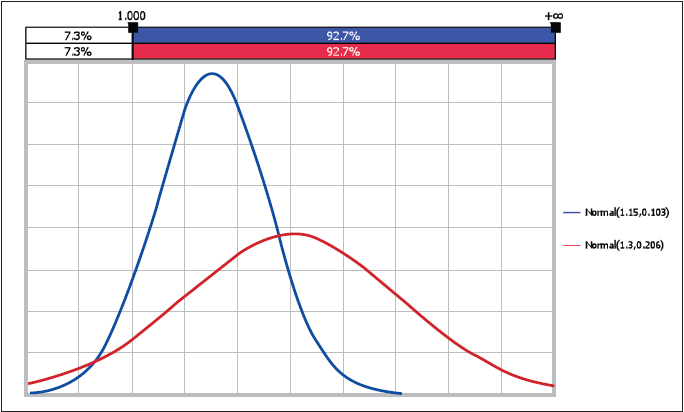 Perhaps there has been over-emphasis placed on the absolute values of coverage ratios, whereas more attention should be paid to coverage ratio volatility or absence thereof? As the illustrative example in figure 4 demonstrates, if you halve cash flow volatility (standard deviation), you can significantly reduce the coverage ratio - in this case, from 1.3x to 1.15x - yet still retain the same probability of default (7.3% sitting south of 1.0x; the 20-year cumulative default rate for an 'A'-rated credit).