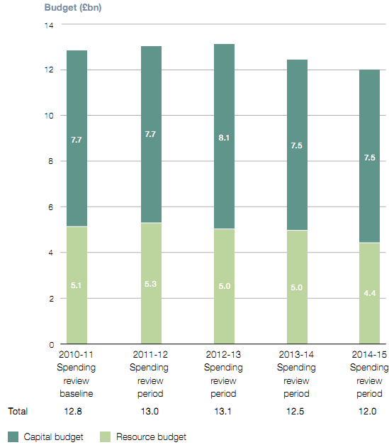 1.4 The emergency budget was followed by a spending review completed in October 2010 to set the Department's budgets from 2011-12 to 2014-15 (Figure 2). In cash terms the overall reduction between the 2010-11 baseline and 2014-15 is 7 per cent. However, inflation, which official forecasts at the time of the spending review showed as averaging 2.4 per cent, meant that the reduction in real terms was 15 per cent. Inflation is currently running higher than forecast and the Department's modelling suggested the additional pressure would be between 1 and 4 per cent of the 2014-15 budget (discussed further in Part Three), which, in the absence of any other changes, could imply an overall real-terms reduction of between 16 and 19 per cent.