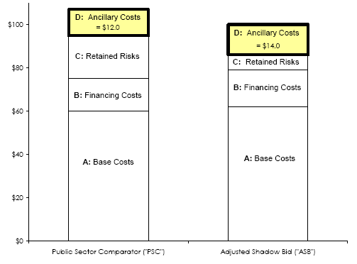 Ancillary costs are quantified and added to each model as applicable. Project management and transaction costs are likely to be higher under AFP given the greater degree of up-front due diligence. As illustrated in figure #5, ancillary costs are higher, at $14 million, under ASB while they are $12 million in the PSC.
