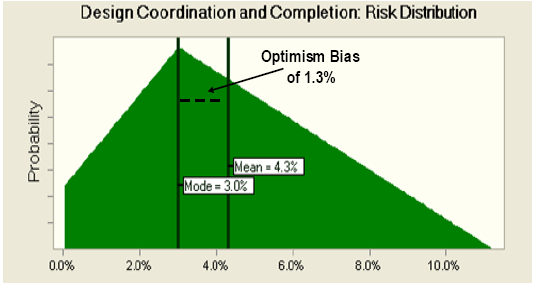 The concept of optimism bias can be further illustrated with our example of Design Coordination and Completeness risk. Assume that this was the only risk that appeared in the risk matrix. While we defined the "Most Likely" impact under the Traditional model at 3.0%, the average or mean for this risk is actually 4.3%, owing to the skewed nature of the distribution10. This is shown in the chart below.