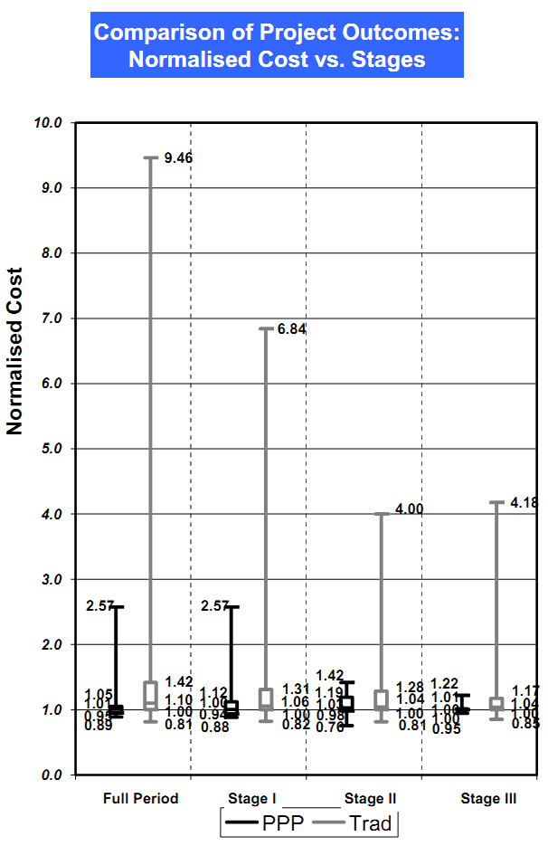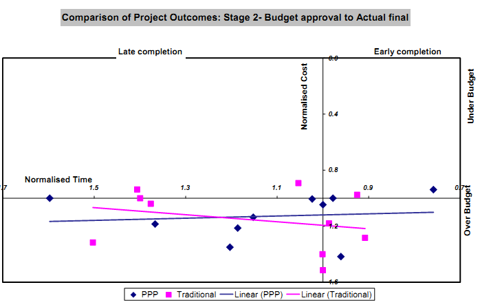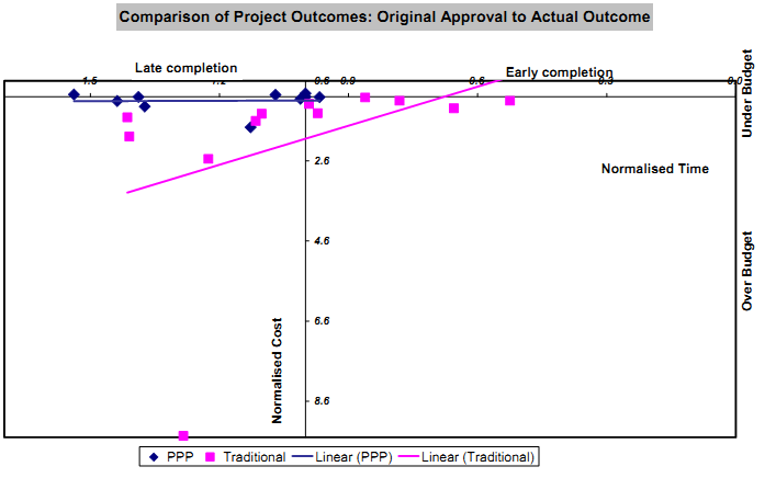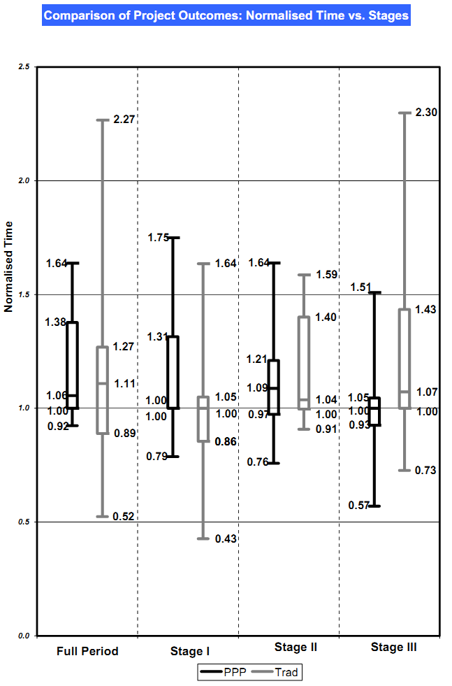 ● The normalised time of PPPs with the value of the project (short duration and low cost projects were adversely affected by time over-runs)