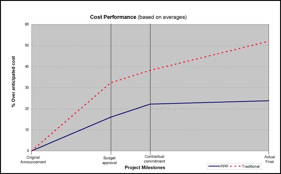 In terms of a comparison of cost performance between Traditionally procured infrastructure and that procured via a PPP mechanism it is concluded that: