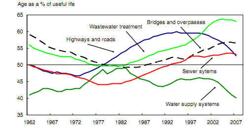 The average age grew slightly in all provinces except Ontario, Manitoba, Saskatchewan and Alberta. The overall moderate ageing trend was fuelled mainly by Quebec, where the average rose from 17.3 in 2001 to 18.1 years in 2007, and British Columbia, where it edged up from 16.6 to 16.9 years during the same period. In 2007, these facilities had passed 53% of their useful life (which is 33.6 years on average) nationally; three decades earlier, this proportion stood at 44%.