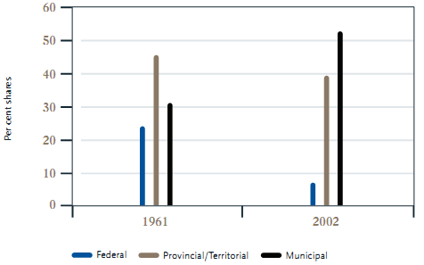 In 1961, during the initial phase of heavy investment in Canada's infrastructure, federal, provincial/territorial and municipal governments each controlled 23.9, 45.3 and 30.9 per cent of the national capital stock, respectively. By 2002, the federal government's share had dropped from 23.9 per cent to 6.8 per cent, and the municipal share had grown from 30.9 to 52.4 per cent of all infrastructure, an increase of nearly 70 per cent.