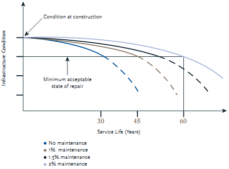 Note that with no maintenance or sporadic deferred maintenance, the infrastructure facility deteriorates very rapidly and with a considerable reduction in its service life. However, if about two per cent of the facility cost is invested in its maintenance, the deterioration rate is much slower, and a considerably longer service life is achieved. This clearly highlights the importance of both maintaining the infrastructure facility adequately and not deferring maintenance under any circumstances.