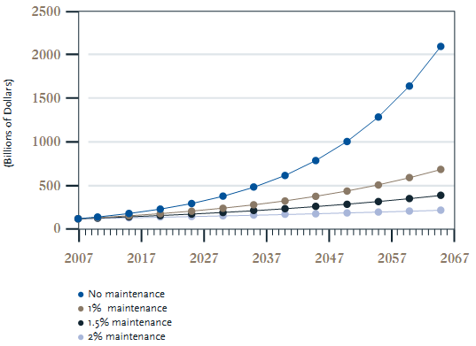 As infrastructure investments declined in the late 1970s and 1980s, maintenance, repair and rehabilitation activities were often deferred, even at the risk of jeopardizing assets and reducing their service life. Reversing this neglect is much more expensive than regular maintenance, so much so that it may not be possible to rehabilitate an asset, which instead must be decommissioned, demolished and constructed anew at an exorbitant cost to the taxpayer.