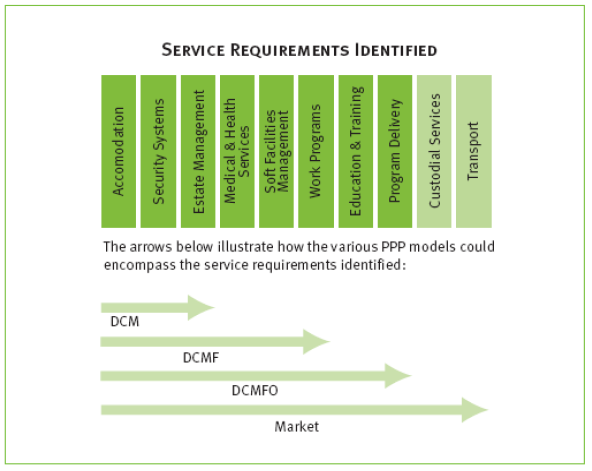 The following diagram illustrates the range of services that may be provided in respect of a new prison facility, utilising some of the aforementioned public private partnership models.