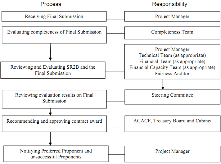 The proponent that has passed the evaluation of technical resubmission and has presented the lowest net present value in its financial offer will be selected as the Preferred Proponent unless the selection criteria is not based on lowest bid, in which case the Preferred Proponent is selected based on the evaluation criteria as set out in the RFQ and RFP.