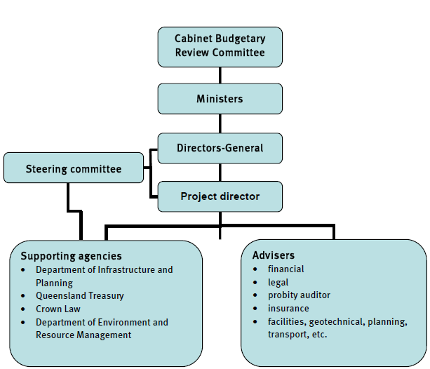 The Department of Infrastructure and Planning and Queensland Treasury representatives on the steering committee will report through their respective Directors-General to the relevant Ministers. Wherever possible, joint Ministerial briefings will be employed.