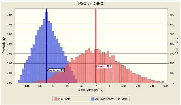 In order to show the values of risks and the whole cost of the public sector comparator and Shadow Bid as a range, it is essential to perform a Monte Carlo distribution. Figure 16 shows the range of costs for a PSC and a DBFO delivery model. In this figure the mean value for the cost of the DBFO is $70 million less than the PSC, indicating positive value for taxpayers.