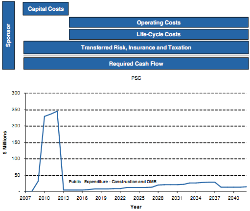 With these inputs, the PSC is constructed by compiling the costs to the owner of pursuing the project traditionally. Figure 2 below presents the corresponding cash flows from the owner's perspective. The line graph shows the profile of capital costs, combined with operating costs and life cycle costs over the time period considered for the project. The bars in the top portion of the diagram show the various components of the line graph below.
