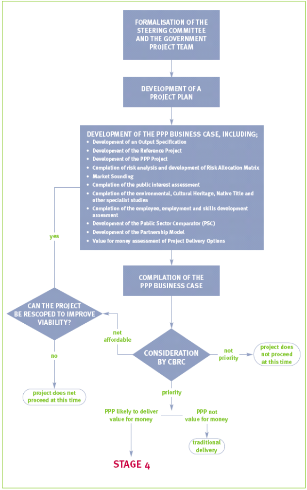 Stage three builds on the preliminary evaluation by developing a comprehensive business case analysing each of the project delivery options. Additional information is available in the public private partnership business case development supporting document.
