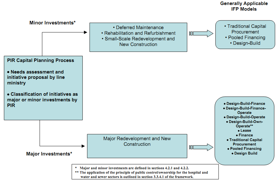 | Traditional Capital Procurement | Following a competitive bidding process, the design and building aspects of an infrastructure asset are contracted out to the private sector at a fixed price that must meet public-sector performance standards. The government or public institution retains ownership. The public sector retains responsibility for ongoing management of the initiative, or may contract out these responsibilities separately. The initiative is funded from general government revenues or debt. |