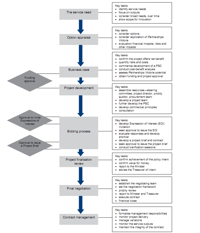 Figure 5B (overleaf) shows the major stages in developing a Partnerships Victoria project. The procurement process extends from the bidding process through to final negotiation.