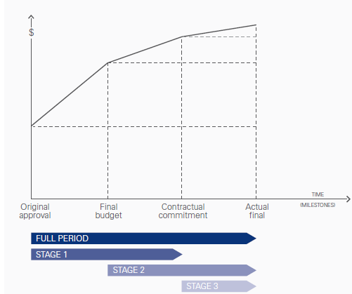 ◀ Figure 3.2 Cost over-runs by stages and milestones