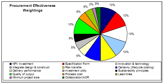 Identifying a systematic procurement evaluation tool requires identification, measurement and weighting of each of these procurement characteristics. In the final analysis, this process is a matter of judgement and the selected weightings will be influenced by subjective views about what is important and what isn't. For these purposes, the weightings used in this comparison were sourced from a review of empirical data that employed procurement performance reviews conducted by state government audit offices and independent procurement reviews commissioned by government and industry in the four countries from which the sample was sourced (See Diagram 1). Additionally, the analysis was tested using both weighted and non-weighted evaluation criteria.