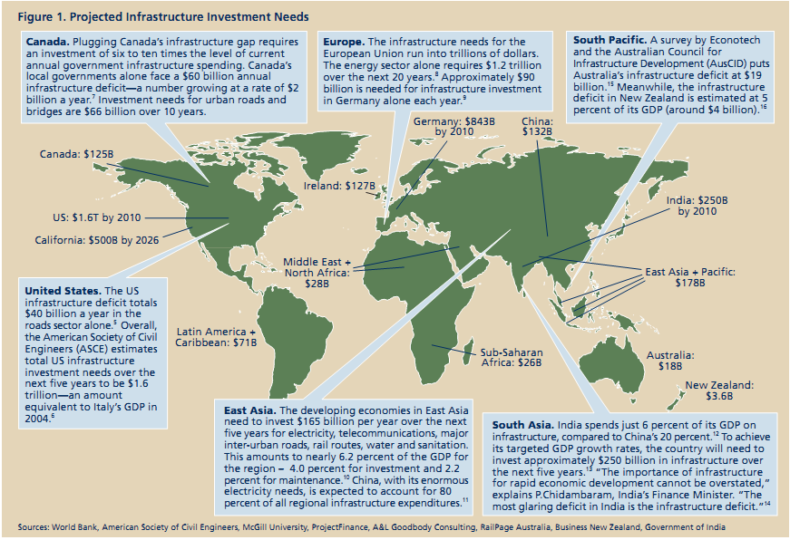 Citizens from New Delhi to New York confront the world's glaring infrastructure deficit daily. From country to country, the large and growing gap between infrastructure needs and the resources governments have historically invested in meeting those needs is obvious everywhere: congested roads; bridges in need of repair; poorly maintained transit systems and recreational facilities; and deteriorated hospitals, schools and waste treatment facilities all in urgent need of rehabilitation and repair (see figure 1). Governments promise many new projects to close the gap, but often do not or cannot find the funding to follow through on their promises.