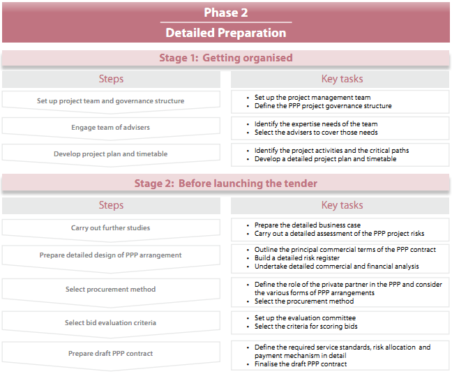 The project procurement phase of the PPP cycle begins after the project has received approval from the relevant public authorities. Such approval should support the development of the project as a PPP. Approval of the main project features is important as a prerequisite for the start of the procurement phase since detailed project preparation is a resource-intensive undertaking.