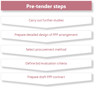 At the end of this stage, the project management team will be ready to prequalify consortia interested in bidding for the project and issue the invitation to tender. It is useful to end this stage at that point because in some jurisdictions high-level clearance will be required before publishing the procurement notice and proceeding with the invitation to tender. The end of the stage is therefore an important mile-stone in the project delivery phase of the PPP cycle.